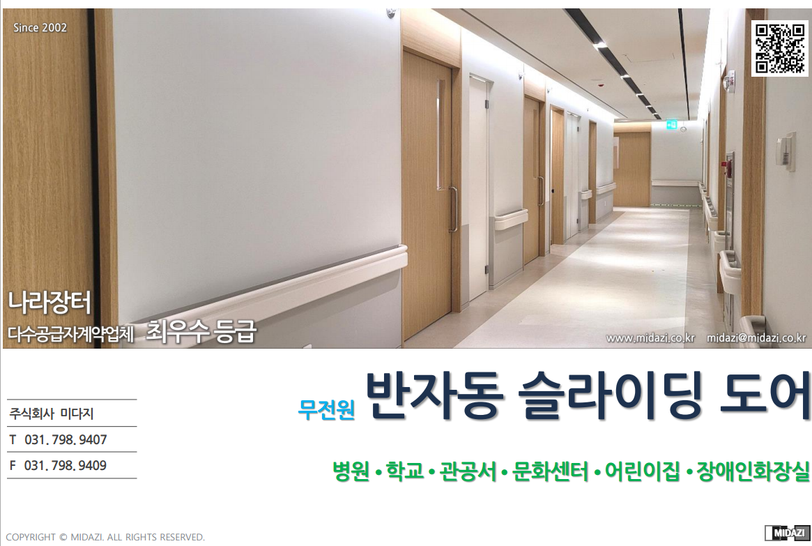 안녕하세요! 오늘은 여러분께 삼화 주식회사 미다지에서 제공하는 무전원 반자동 슬라이딩 도어 시스템을 소개해드리려고 합니다. 삼화 주식회사 미다지는 2002년부터 꾸준히 고품질의 슬라이딩 도어를 공급해 온 업체로, 병원, 학교, 관공서, 문화센터, 어린이집 등 다양한 시설에서 그 우수성을 인정받고 있습니다.