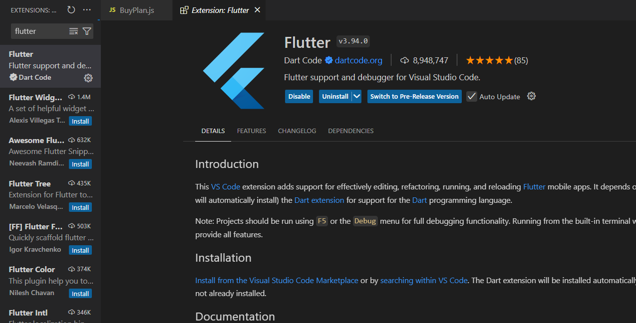 - VS Code의 확장(Extensions) 탭에서 "Flutter"를 검색한 후, "Flutter" 플러그인을 설치합니다.