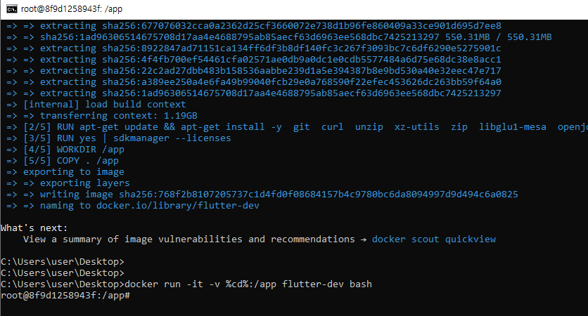 docker build -t flutter-dev . docker run -it -v $(pwd):/app flutter-dev bash - 위 명령어를 통해 현재 디렉토리를 컨테이너의 /app 디렉토리에 마운트하고, Flutter 개발 환경을 실행할 수 있습니다
