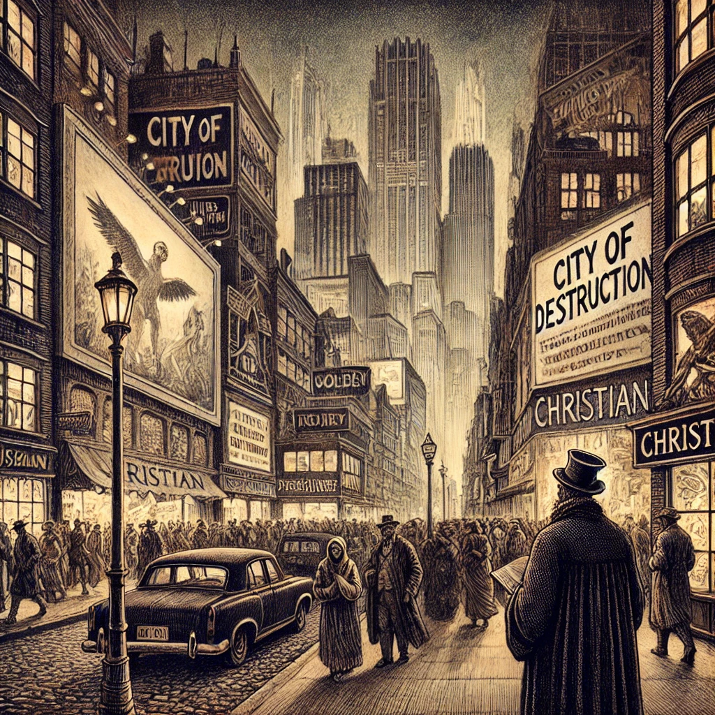 크리스천은 "멸망의 도시"에서 다른 주민들과 마찬가지로 평범하게 살아가고 있었습니다. 이 도시는 겉으로 보기에는 번영하고 활기찬 곳처럼 보였지만, 그 이면에는 깊은 불안과 공허함이 자리 잡고 있었습니다. 크리스천은 매일 아침 일어나면 도시의 거리를 걸으며 사람들의 삶을 관찰했습니다. 그들은 모두 자기 일에 몰두하고, 쾌락과 물질적 풍요를 추구하며 살아가고 있었지만, 크리스천의 마음 한구석에는 알 수 없는 불안감이 자리하고 있었습니다.