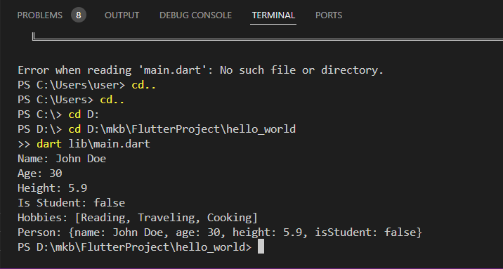 - Dart 코드를 실행하여 출력 결과를 확인합니다. 코드는 Dart SDK가 설치된 터미널에서 다음 명령어로 실행할 수 있습니다: