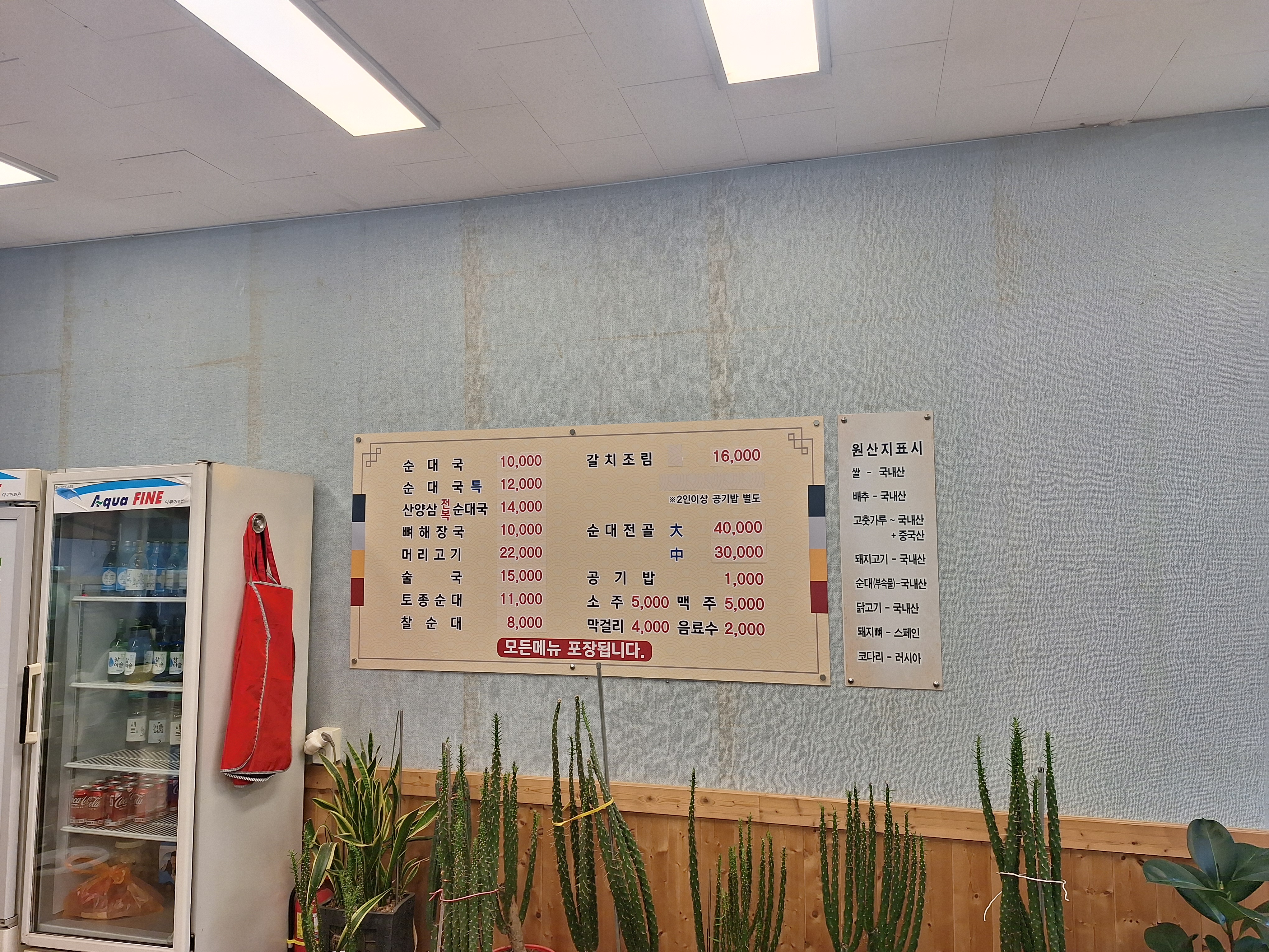가게 내부로 들어가면 가장 먼저 눈에 들어오는 메뉴판! 가격도 매우 합리적입니다. 순대국은 10,000원, 순대국(특)은 12,000원으로, 푸짐한 한 끼 식사를 즐길 수 있는 가격이었어요. 이외에도 머리고기, 토종순대 등 다양한 메뉴가 준비되어 있었어요.