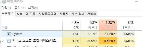 윈도우 10에서 디스크 사용량이 100%일 때 점검해야 할 부분들
