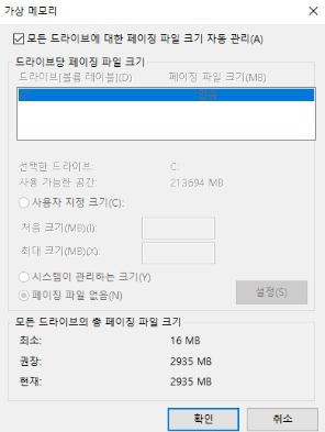 가상 메모리 설정 조정: