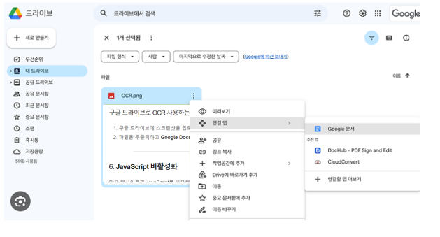 - 파일을 우클릭하고 Google Docs로 열기를 선택하면 텍스트가 자동으로 변환됩니다.