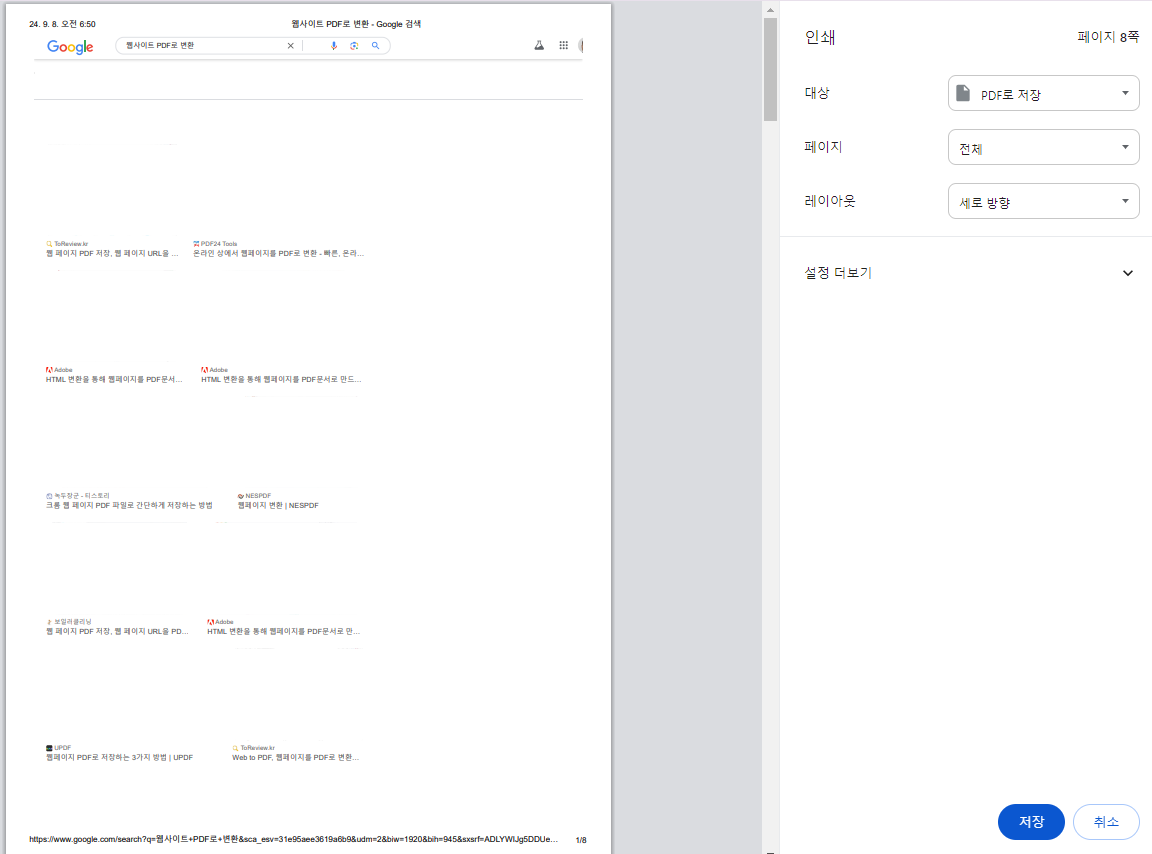 - 대상 프린터를 'PDF로 저장'으로 선택하고, 저장합니다.