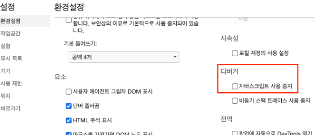 - JavaScript 설정에서 특정 웹사이트의 JavaScript를 비활성화하거나 전체 JavaScript를 일시적으로 비활성화합니다.