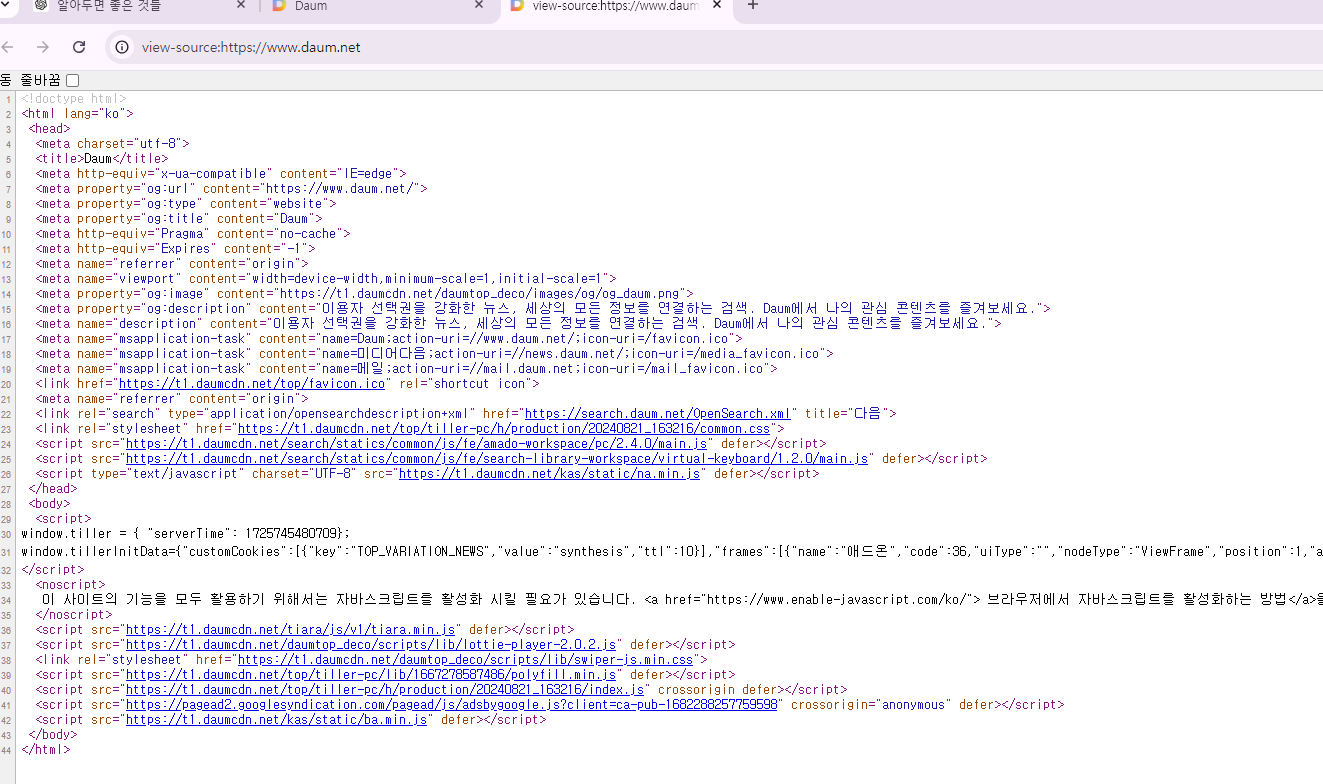 - Ctrl + U 또는 우클릭 후 페이지 소스 보기를 선택합니다.