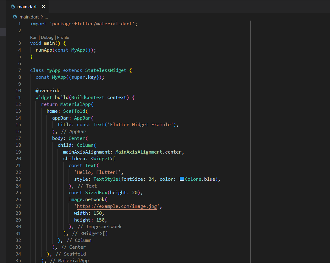 import 'package:flutter/material.dart'; void main() { runApp(const MyApp()); } class MyApp extends StatelessWidget { const MyApp({super.key}); @override Widget build(BuildContext context) { return MaterialApp( home: Scaffold( appBar: AppBar( title: const Text('Flutter Widget Example'), ), body: Center( child: Column( mainAxisAlignment: MainAxisAlignment.center, children: <Widget>[ const Text( 'Hello, Flutter!', style: TextStyle(fontSize: 24, color: Colors.blue), ), const SizedBox(height: 20), Image.network( 'https://example.com/image.jpg', width: 150, height: 150, ), ], ), ), ), ); } }