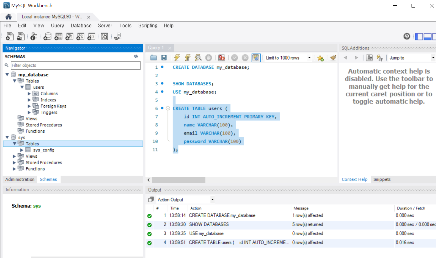 - 데이터베이스에 사용할 테이블을 생성합니다. 예시로 users 테이블을 생성해 보겠습니다: