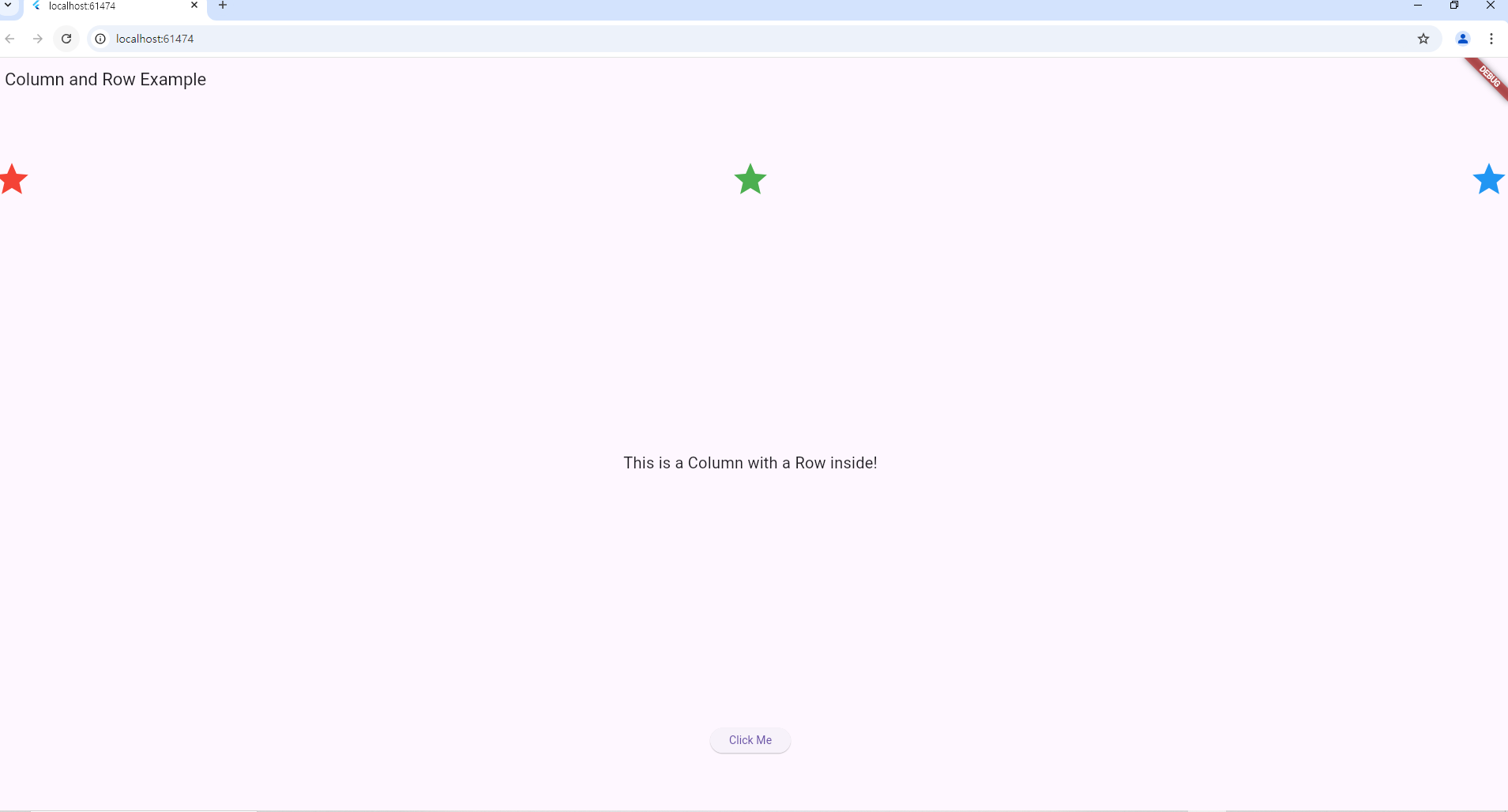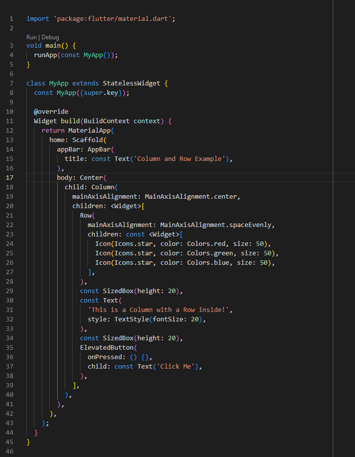 import 'package:flutter/material.dart'; void main() { runApp(const MyApp()); } class MyApp extends StatelessWidget { const MyApp({super.key}); @override Widget build(BuildContext context) { return MaterialApp( home: Scaffold( appBar: AppBar( title: const Text('Column and Row Example'), ), body: Center( child: Column( mainAxisAlignment: MainAxisAlignment.center, children: <Widget>[ Row( mainAxisAlignment: MainAxisAlignment.spaceEvenly, children: const <Widget>[ Icon(Icons.star, color: Colors.red, size: 50), Icon(Icons.star, color: Colors.green, size: 50), Icon(Icons.star, color: Colors.blue, size: 50), ], ), const SizedBox(height: 20), const Text( 'This is a Column with a Row inside!', style: TextStyle(fontSize: 20), ), const SizedBox(height: 20), ElevatedButton( onPressed: () {}, child: const Text('Click Me'), ), ], ), ), ), ); } }