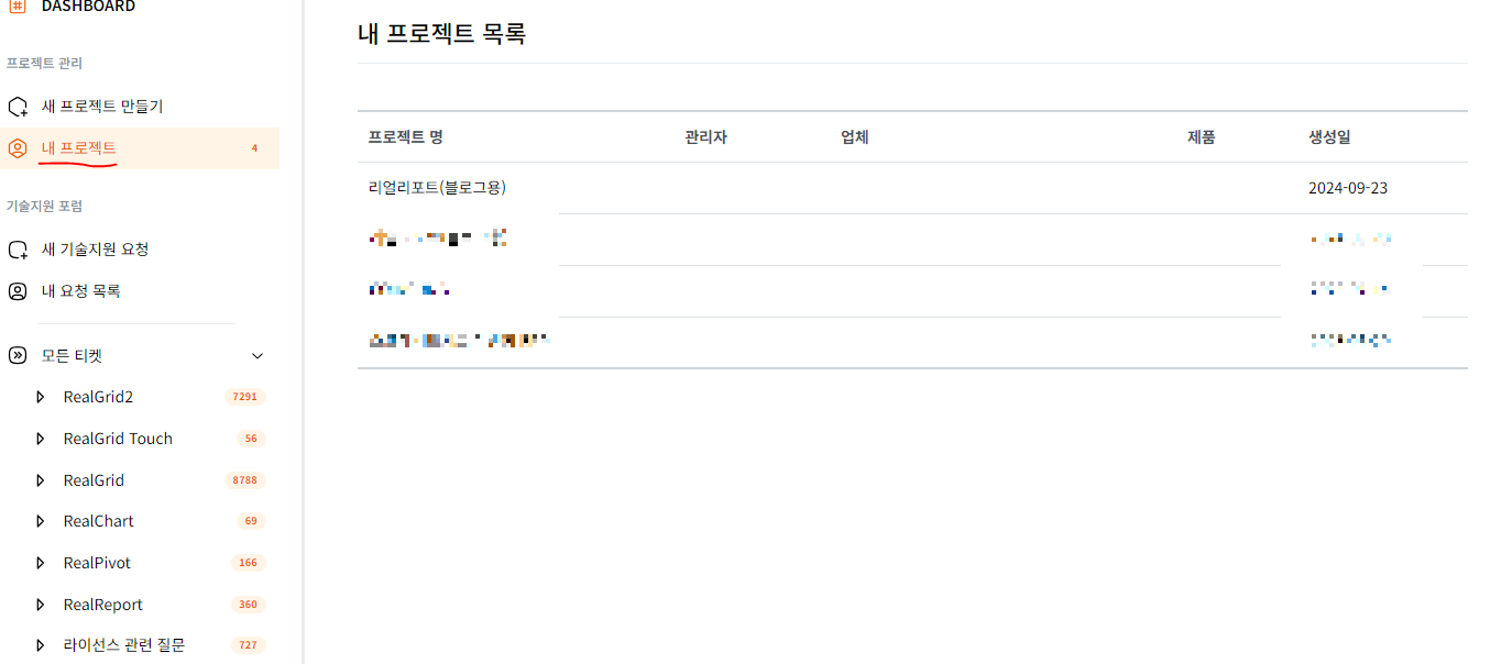 리얼리포트 프로젝트 관리 메뉴에서 새 프로젝트 만들기 - 프로젝트 이름을 입력하고 프로젝트를 생성합니다. 예를 들어, **리얼리포트(블로그용)**과 같이 적절한 이름을 사용합니다.