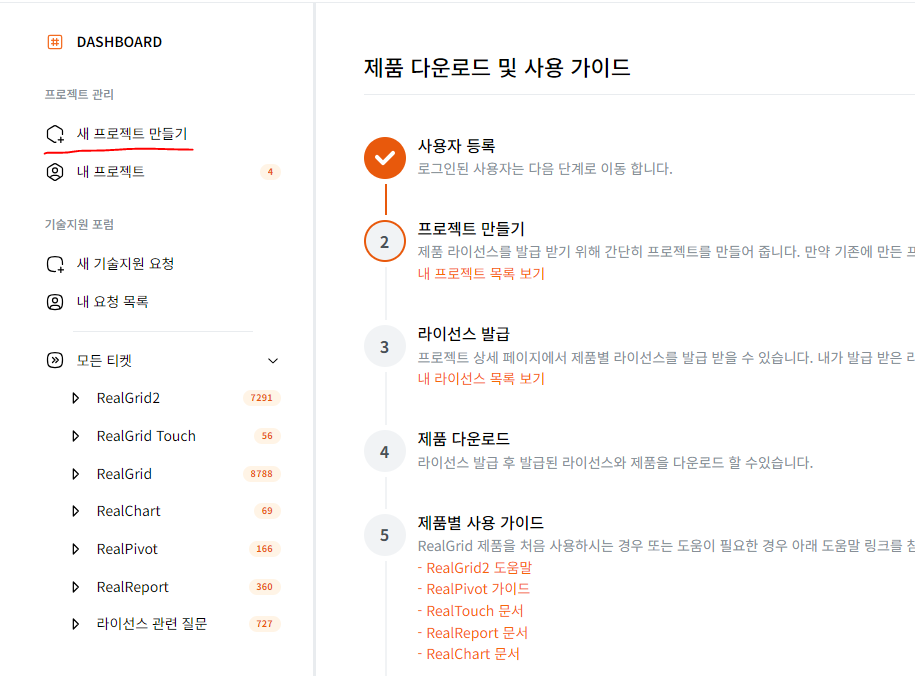 - 화면의 좌측에 있는 프로젝트 관리 메뉴에서 새 프로젝트 만들기를 선택합니다.