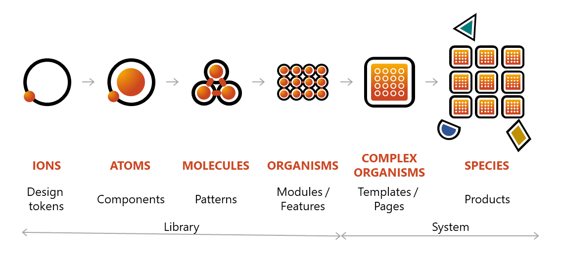 Atomic Design은 Brad Frost가 제안한 방법론으로, UI를 원자(Atoms), 분자(Molecules), 유기체(Organisms), 템플릿(Templates), **페이지(Pages)**의 다섯 가지 수준으로 나누어 설계하는 방식입니다. 이 방식은 특히 디자인 시스템과 컴포넌트 라이브러리 구축에 적합합니다.