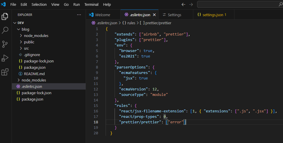 - .eslintrc.json 파일에 다음 설정을 추가합니다: