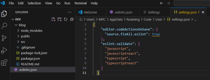 { "editor.codeActionsOnSave": { "source.fixAll.eslint": true }, "eslint.validate": [ "javascript", "javascriptreact", "typescript", "typescriptreact" ] }