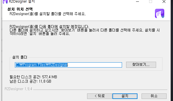 - 설치 시작: "설치" 버튼을 클릭하면 R2 디자이너 설치가 시작됩니다. 설치 과정은 시스템 사양에 따라 몇 분 정도 소요될 수 있습니다.