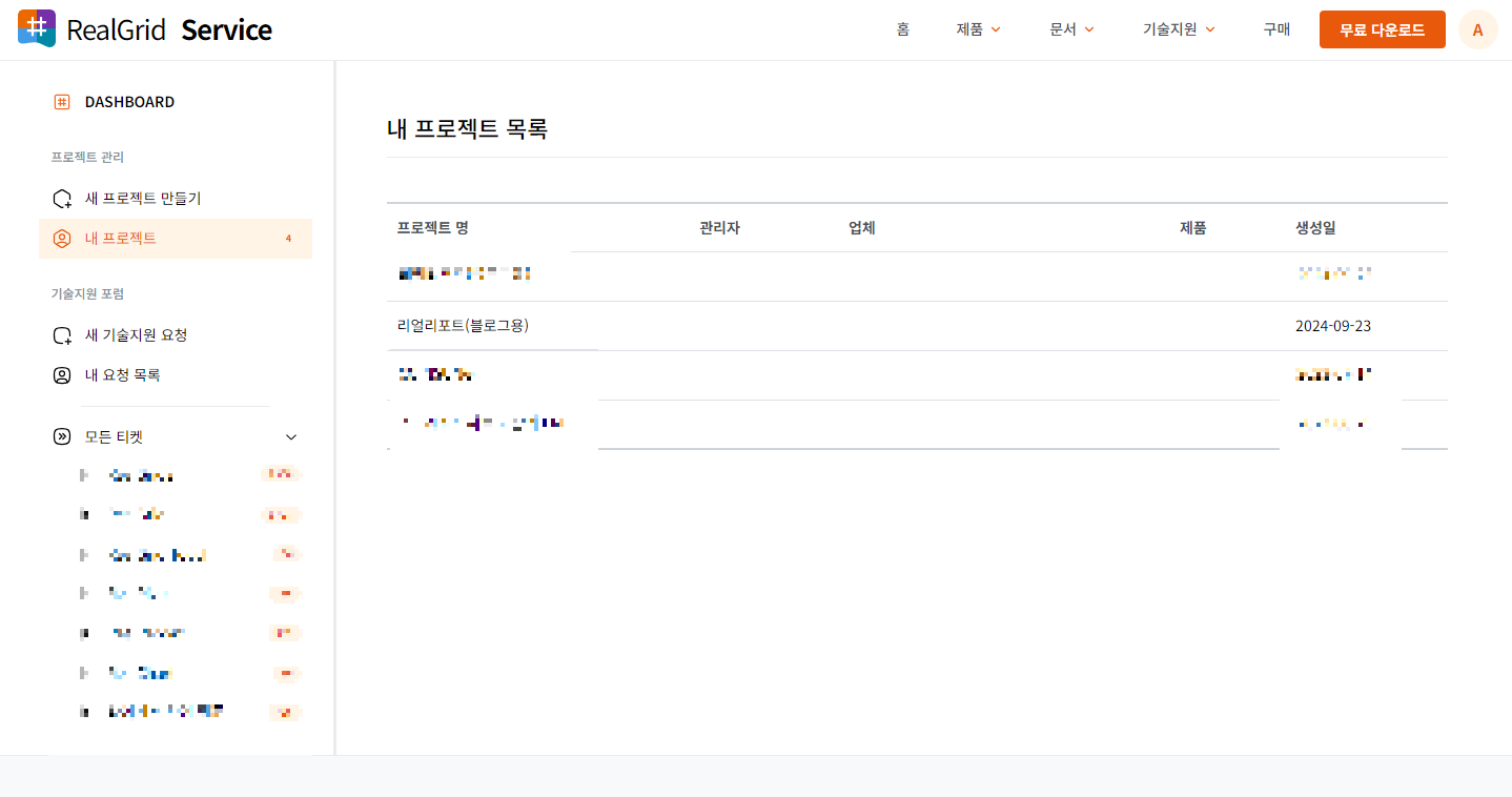 - 라이선스 및 설치파일 다운: '새 프로젝트 만들기' 혹은 기존에 생성한 프로젝트가 있다면 '내 프로젝트'에서 프로젝트를 선택한 후