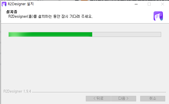 - 설치 시작: "설치" 버튼을 클릭하면 R2 디자이너 설치가 시작됩니다. 설치 과정은 시스템 사양에 따라 몇 분 정도 소요될 수 있습니다.