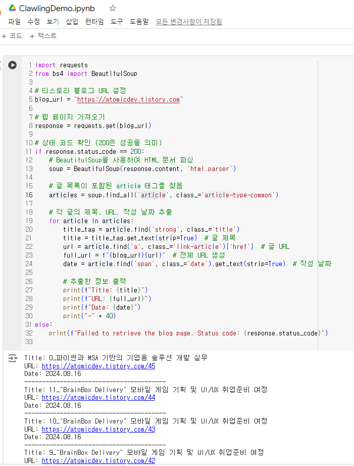 다음은 티스토리 블로그에서 글 목록을 크롤링하는 Python 코드를 작성하는 실습입니다.