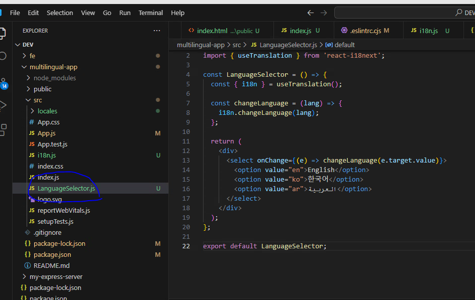 - 위에서 작성한 LanguageSelector 컴포넌트를 사용하여 언어 선택 기능을 추가합니다.