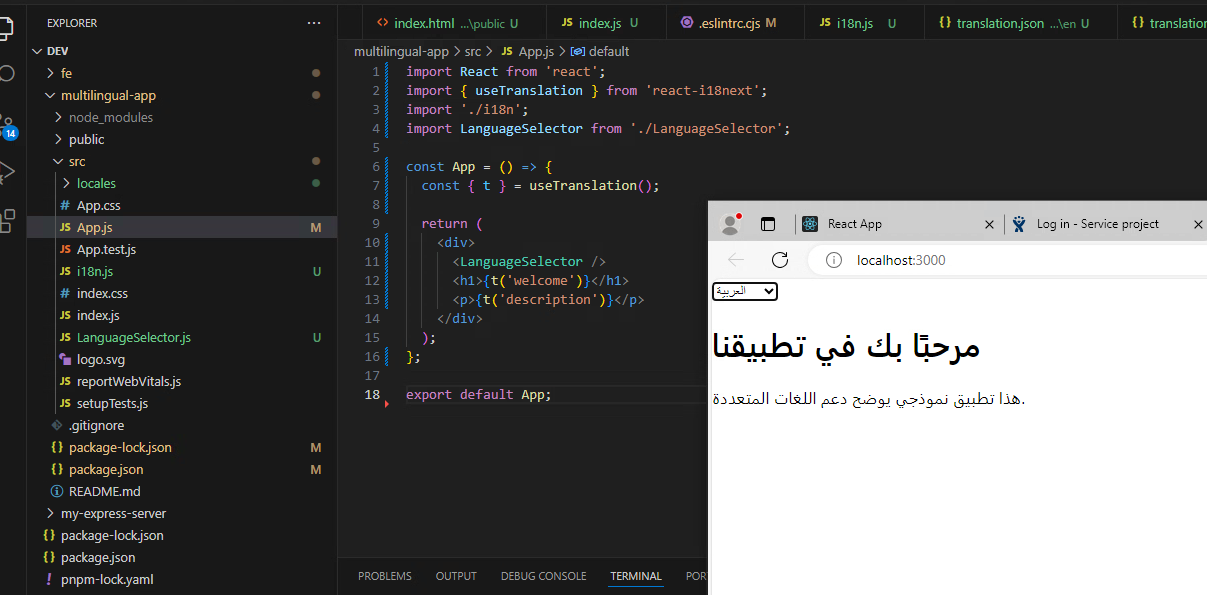 - 한국어를 선택하면 "우리 애플리케이션에 오신 것을 환영합니다"라는 번역된 텍스트가 보이고, 아랍어를 선택하면 해당 언어로 변환된 콘텐츠가 표시됩니다.