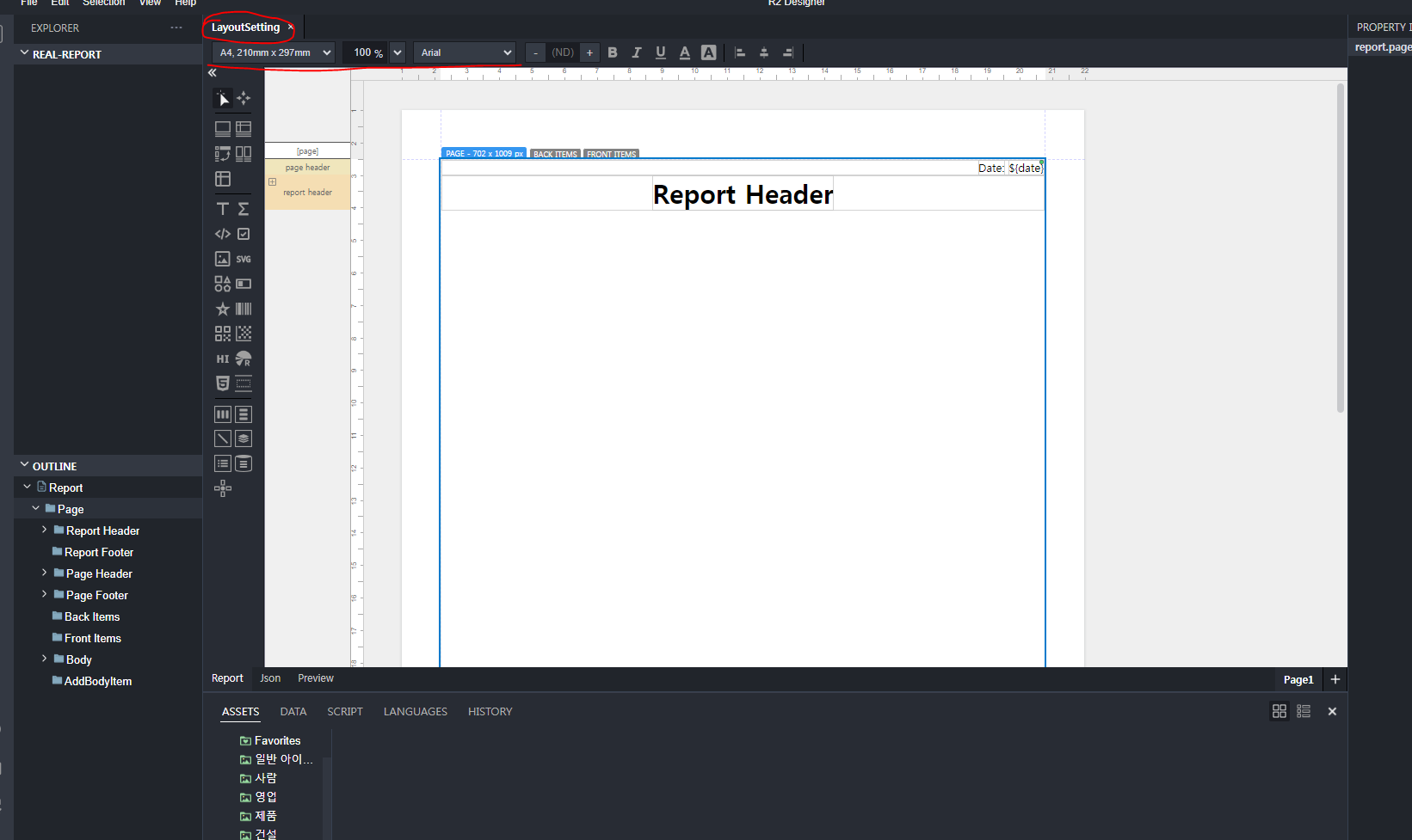 - 리포트가 열리면, 상단 메뉴에서 **'페이지 설정(LayoutSetting)'**을 선택합니다.