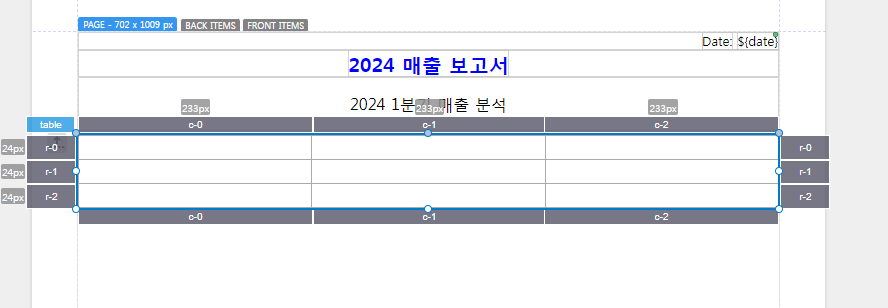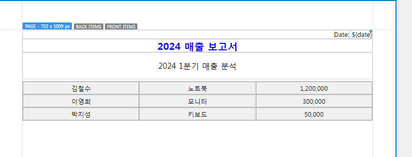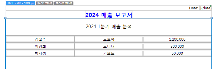본문은 보고서의 주요 내용을 담는 부분으로, 텍스트와 표를 추가하여 데이터를 표현할 수 있습니다. 프로퍼티 패널을 이용해 레이아웃과 스타일을 쉽게 설정할 수 있습니다.