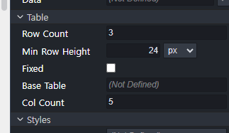 - 테이블이 추가되면, 프로퍼티 패널에서 **열(Column)**과 **행(Row)**의 개수를 설정할 수 있습니다.