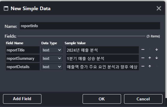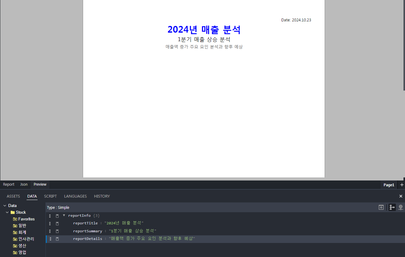 - 고정 데이터 추가: 리포트 제목, 작성일 등의 값을 설정할 수 있습니다.