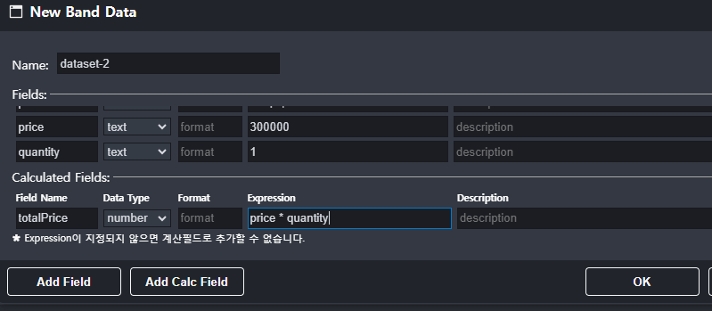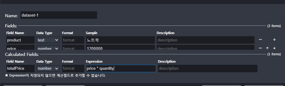 - Calculated Field 추가: 총 매출액(totalPrice) = 가격(price) * 수량(quantity)