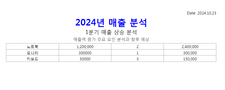 - 제목: "2024년 매출 분석" (굵게, 24px, 파란색)