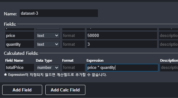 - Calculated Field 추가: 총 매출액(totalPrice) = 가격(price) * 수량(quantity)