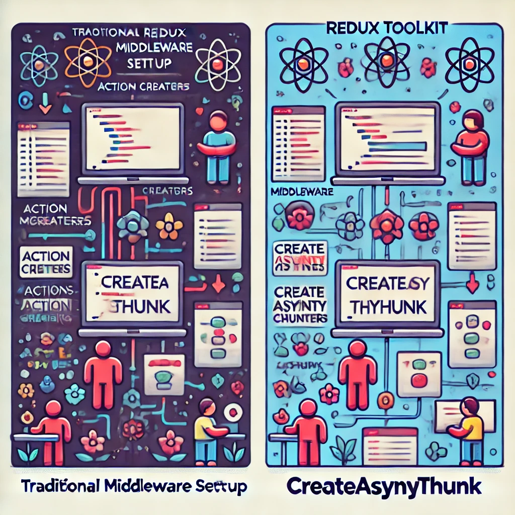 이번 포스팅에서는 Redux Toolkit의 createAsyncThunk를 사용하여 비동기 처리를 간소화하고, 미들웨어 설정을 어떻게 개선할 수 있는지를 Before -> After 형식으로 설명하겠습니다. createAsyncThunk는 비동기 작업을 위한 간편한 방법을 제공하여 코드의 복잡성을 줄이고 유지보수를 쉽게 만듭니다.