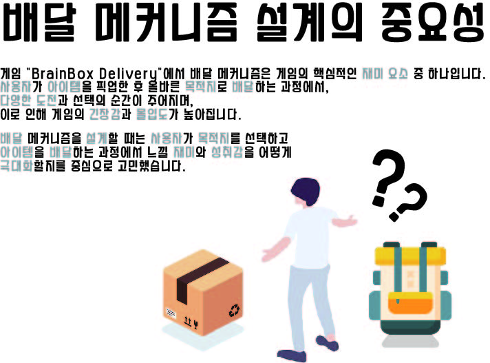 게임 "BrainBox Delivery"에서 배달 메커니즘은 게임의 핵심적인 재미 요소 중 하나입니다. 사용자가 아이템을 픽업한 후 올바른 목적지로 배달하는 과정에서, 다양한 도전과 선택의 순간이 주어지며, 이로 인해 게임의 긴장감과 몰입도가 높아집니다. 배달 메커니즘을 설계할 때는 사용자가 목적지를 선택하고 아이템을 배달하는 과정에서 느낄 재미와 성취감을 어떻게 극대화할지를 중심으로 고민했습니다.