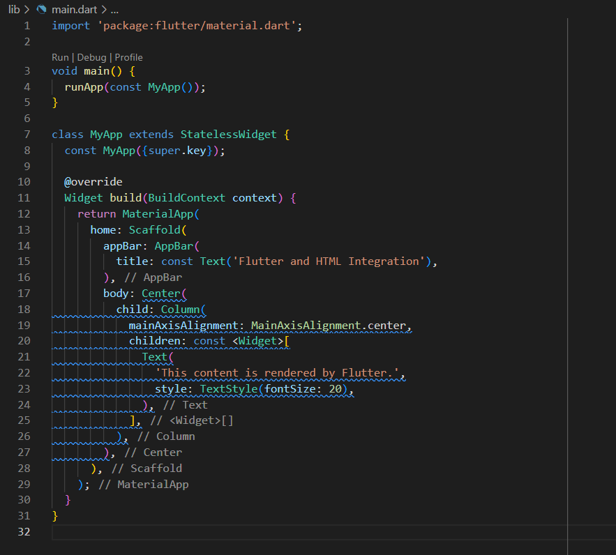 - HtmlElementView(viewType: 'custom-html-content')는 index.html의 특정 HTML 요소를 Flutter UI에 포함합니다.