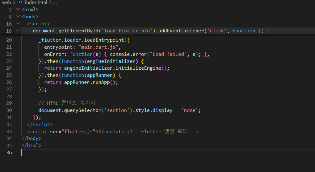 - id="load-flutter-btn" 버튼을 클릭하면 JavaScript 이벤트 리스너가 실행됩니다.