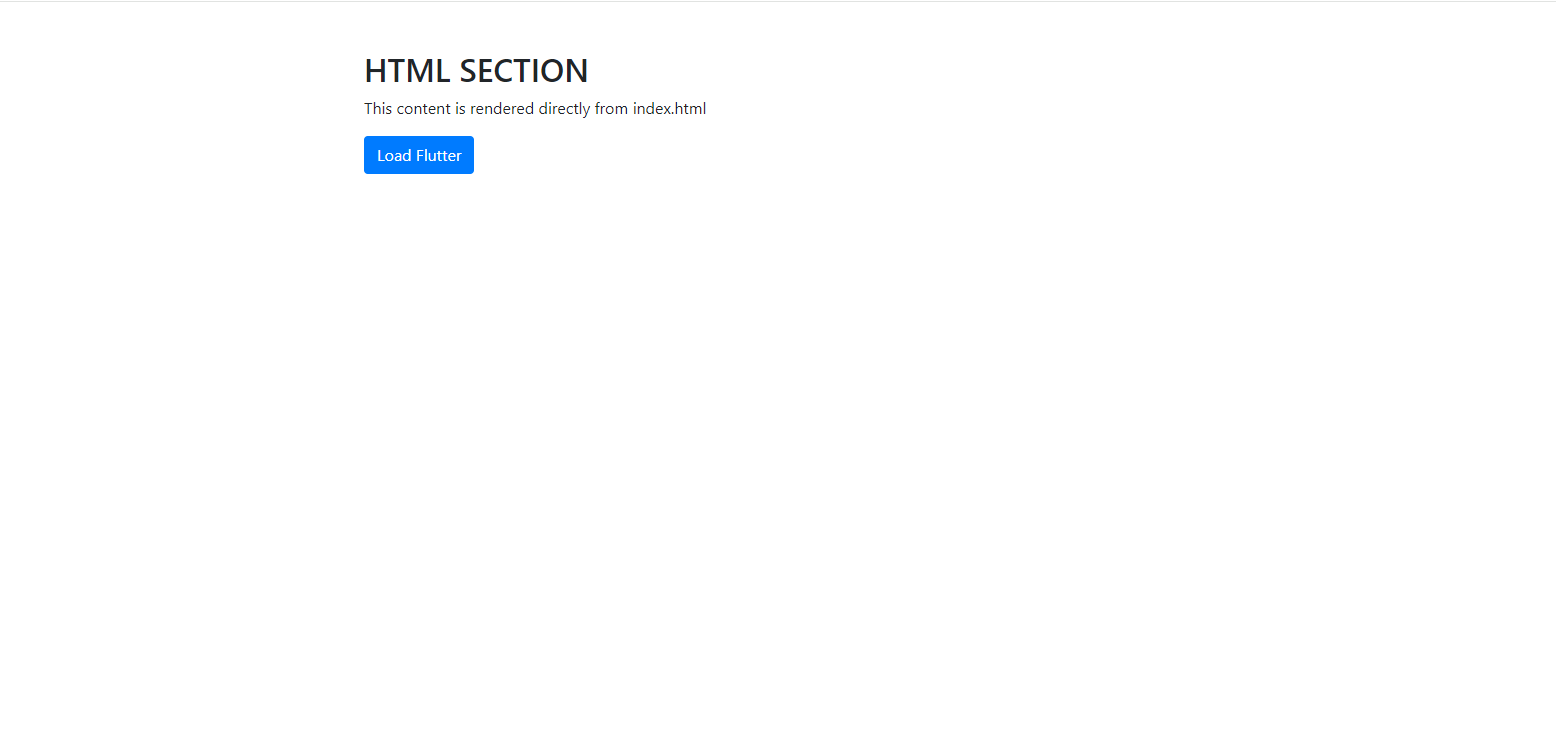 - HTML SECTION, This content is rendered directly from index.html, 그리고 Load Flutter 버튼이 화면에 표시됩니다.