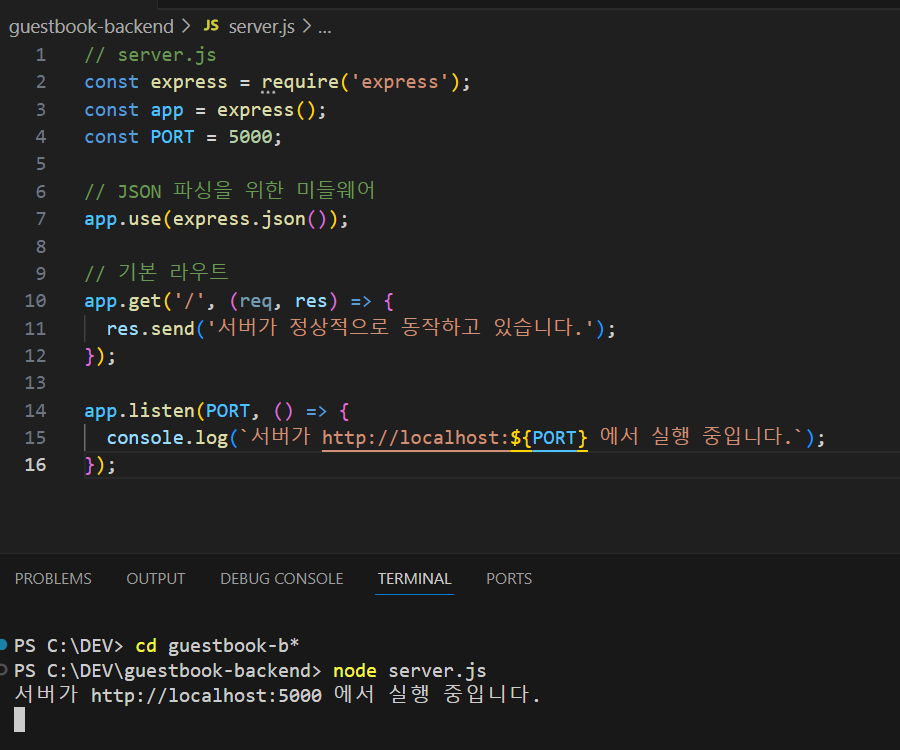 프로젝트 폴더를 만들고, 터미널을 열어 다음 명령어를 사용해 Node.js 프로젝트를 초기화합니다.위 명령어로 생성된 package.json 파일에는 프로젝트의 기본 정보와 의존성을 관리하는 설정이 포함됩니다.mkdir guestbook-backend cd guestbook-backend npm init -y -