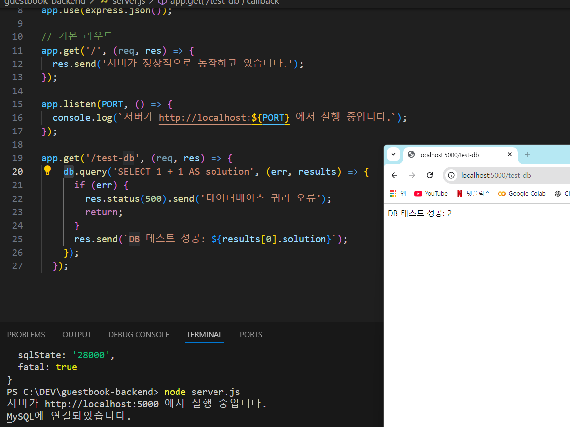 브라우저에서 http://localhost:5000/test-db에 접속하여 "DB 테스트 성공: 2"라는 응답을 받으면 데이터베이스 연결이 정상적으로 이루어진 것입니다.// server.js const db = require('./db'); app.get('/test-db', (req, res) => { db.query('SELECT 1 + 1 AS solution', (err, results) => { if (err) { res.status(500).send('데이터베이스 쿼리 오류'); return; } res.send(`DB 테스트 성공: ${results[0].solution}`); }); });