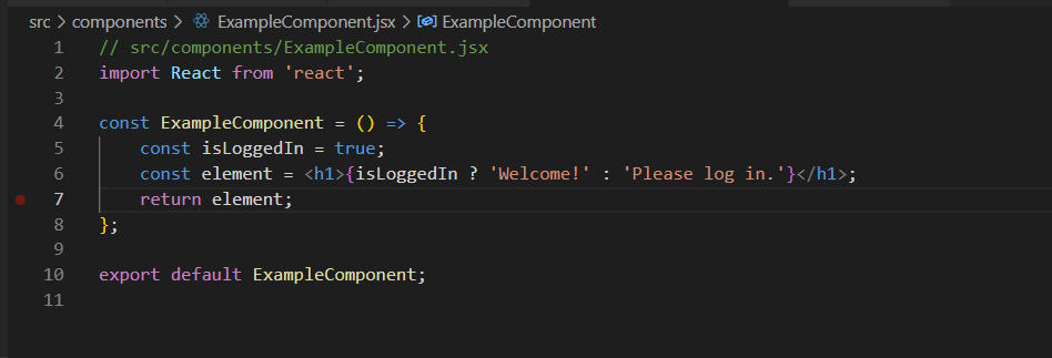 - const isLoggedIn = true; const element = <h1>{isLoggedIn ? 'Welcome!' : 'Please log in.'}</h1>; return element;