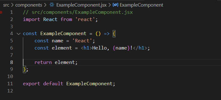 const name = 'React'; const element = <h1>Hello, {name}!</h1>; // JSX를 반환해야 렌더링됩니다. return element;
