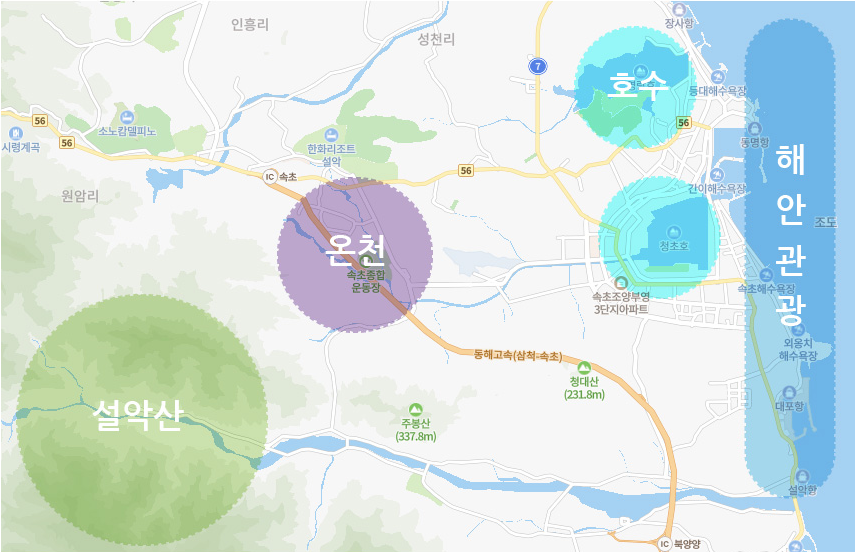 이처럼 척산온천장을 중심으로 속초와 고성의 주요 관광지를 쉽게 방문할 수 있어, 온천욕과 더불어 다양한 즐길 거리를 경험할 수 있습니다.