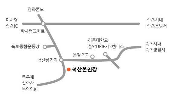 척산온천장은 속초 시내에서 차로 약 10분 거리에 있어 접근성이 매우 좋습니다. 서울에서도 고속도로로 2시간 조금 더 걸렸습니다. 고성에서도 가까워 속초와 고성을 여행하는 중간에 들르기 좋은 위치입니다.