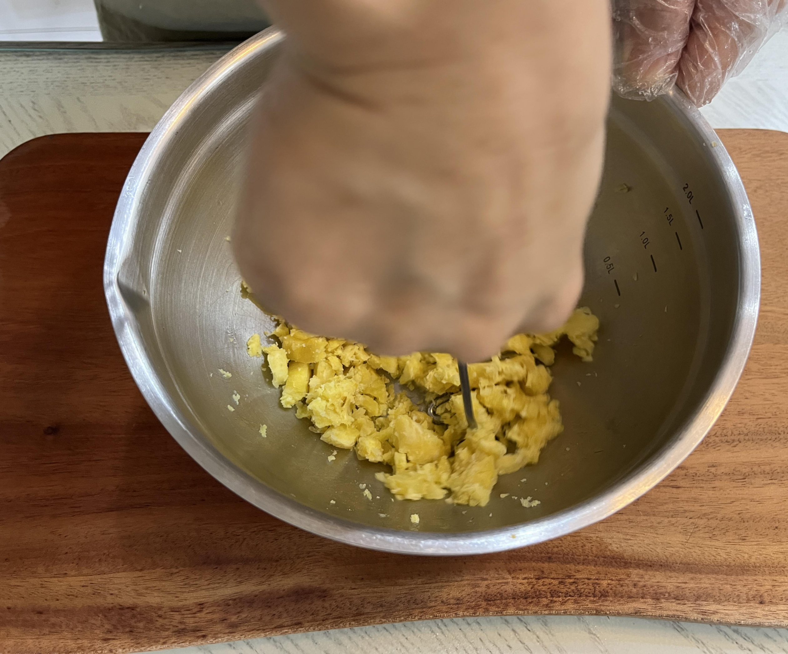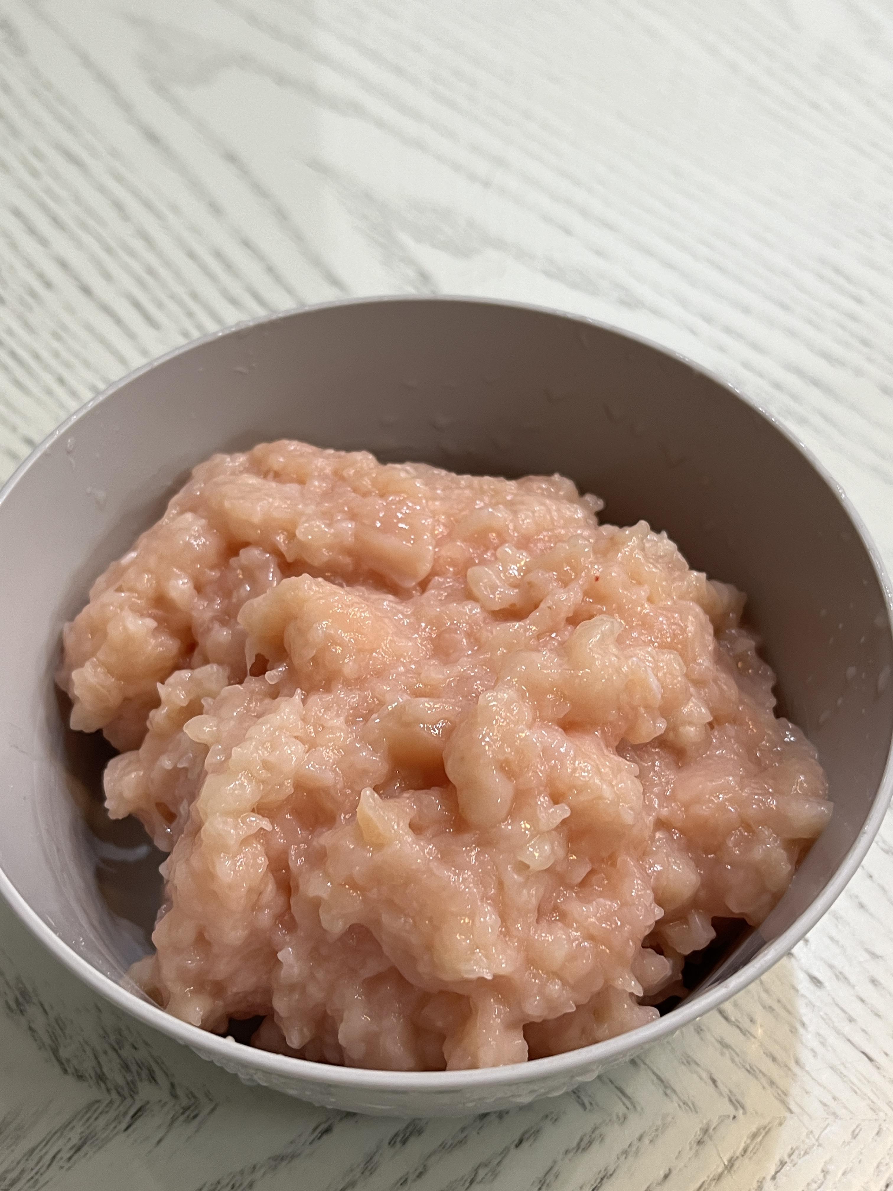 - 닭 가슴살과 고구마 준비: 닭 가슴살을 다지듯 잘게 썰어주세요. 고구마는 익혀서 부드럽게 으깨어줍니다. 이 두 재료를 큰 믹싱 볼에 넣고 잘 섞어줍니다.