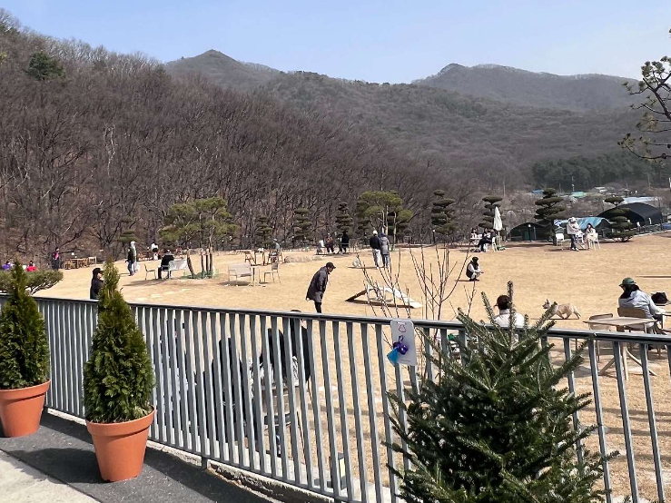 카페의 하이라이트는 넓은 잔디 운동장이었습니다. 날씨가 아직 쌀쌀했지만, 비닐하우스가 마련되어 있어 따뜻하게 즐길 수 있었습니다. 이곳에서 반려견들이 자유롭게 뛰어놀 수 있는 공간이 제공되어 있어, 반려견과 함께 방문하기에 아주 좋은 장소였습니다.