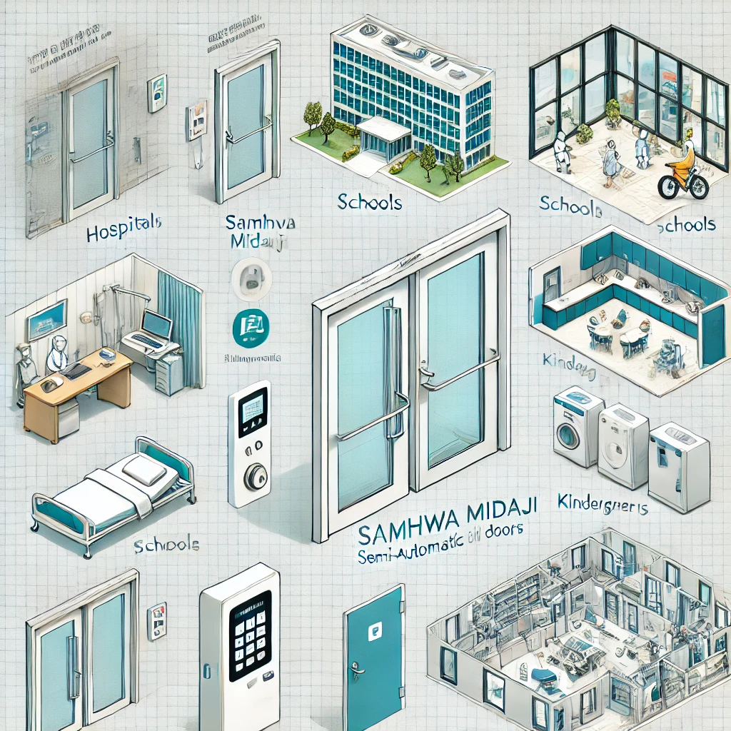 삼화 미다지의 반자동 슬라이딩 도어는 병원, 학교, 어린이집, 공공기관 등 다양한 장소에서 활용되고 있습니다. 고객의 요구에 따라 디지털 도어락, 시창, 봉형열쇠 등 다양한 옵션을 추가할 수 있으며, 설치 환경에 맞게 사이즈 변경도 가능합니다.