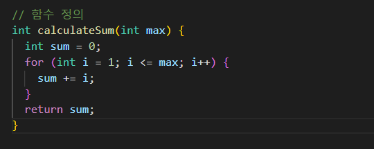 - 함수: calculateSum 함수는 1부터 max까지의 합을 계산하여 반환합니다.