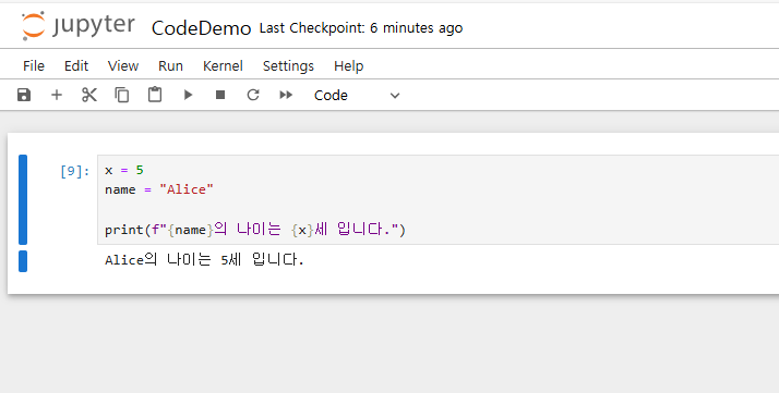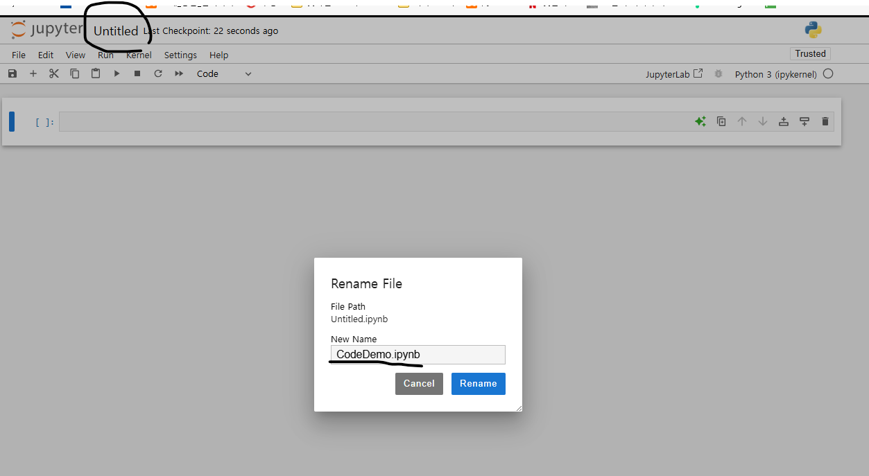 - 생성된 Untitled 노트북의 죄측 상단 이름을 클릭하여 이름을 CodeDemo.ipynb 로 변경한다.
