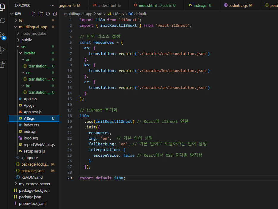 src/i18n.js 파일을 생성하고 위에서 설명한 코드대로 i18next를 초기화합니다. 이 파일은 번역 리소스를 로드하고 기본 언어 및 Fallback 언어를 설정합니다.